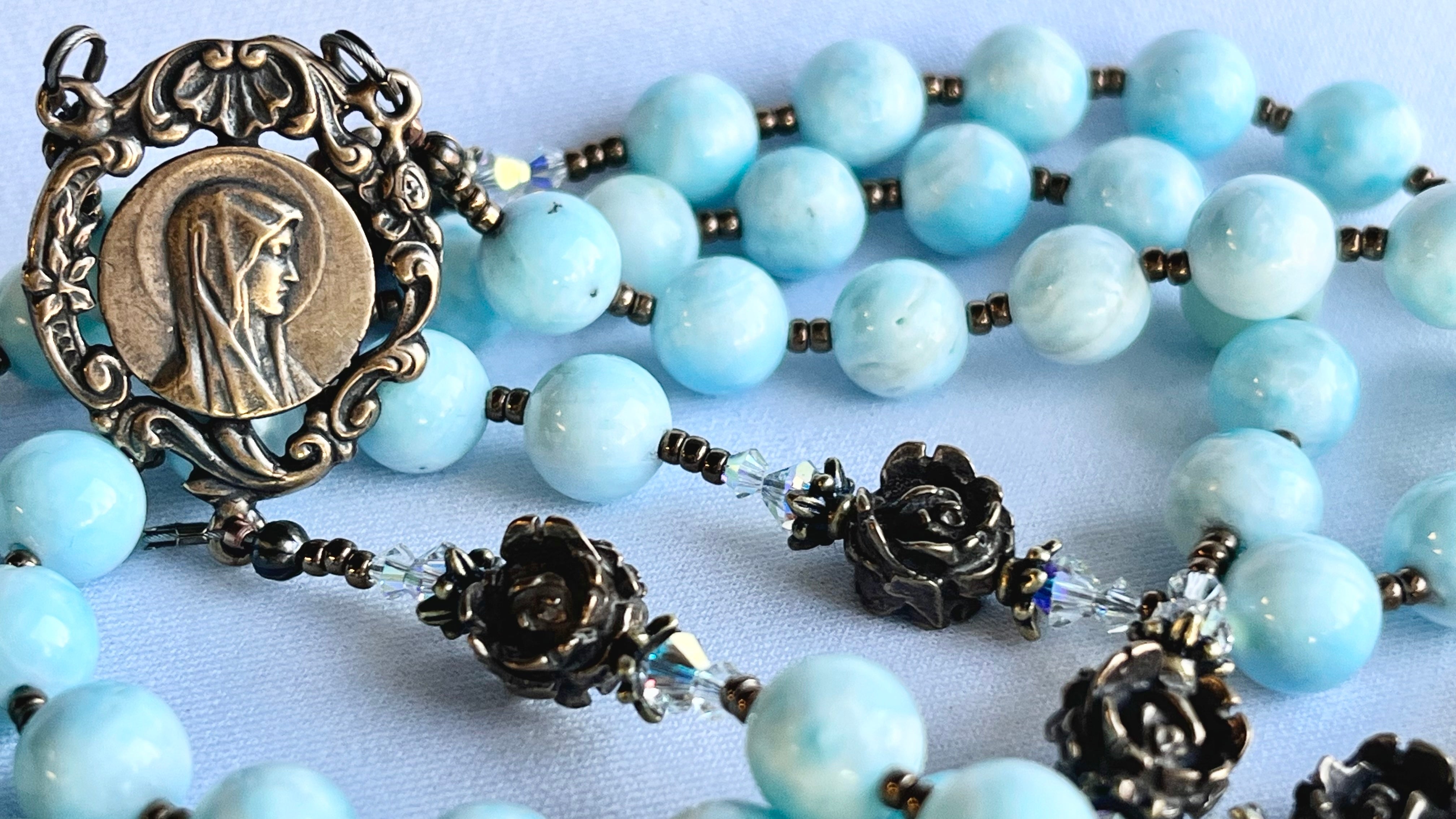 Aquamarine and Bronze Lourdes Center and Elaborate Scrolls Crucifix